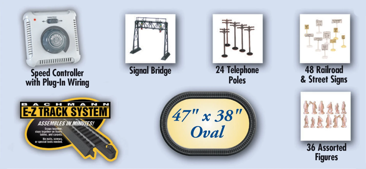 - 47″ x 38″ oval of snap-fit E-Z Track®, including 12 pieces curved track, 1 piece straight track, and 1 plug-in terminal rerailer
