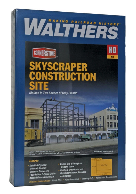 Add a unique city scene to your layout with the Walthers Cornerstone HO Scale Skyscraper Construction Site. This easy-to-build kit includes girder work, sidewalk safety canopy and appropriate signs for vintage or modern scenes. Decals for skyscraper construction contractor vehicles and equipment are also included. Add the Skyscraper Construction Site to your city scenes among other Cornerstone HO Scale businesses.