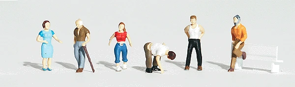 You might see these six people on any street. A man is bending over to pick up something. A woman is waving “hi.” A man walks down the street with his cane and a strong, young man, clad in a muscle shirt stands looking around. A woman is out for a walk and a man leans against a wall. Set contains 6 pieces. Colors may vary from actual product.